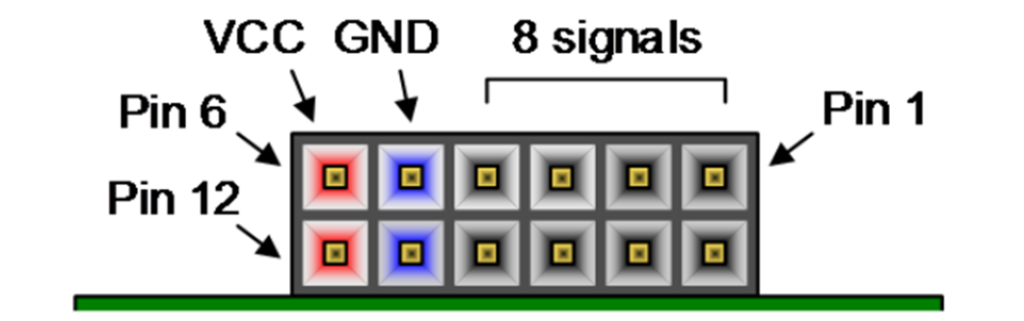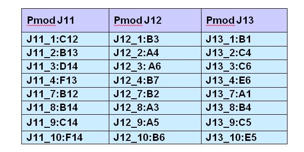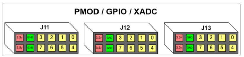 The Pmod ports are arranged in a 2×6 right-angle, and are 100-mil female connectors that mate with standard 2×6 pin headers. Each 12-pin Pmod ports provides two 3.3V VCC signals (pins 6 and 12), two Ground signals (pins 5 and 11), and eight logic signals. The VCC and Ground pins can deliver up to 1A of current. Pmod data signals are not matched pairs, and they are routed using best-available tracks without impedance control or delay matching. Pin assignments for the Pmod I/O connected to the FPGA are shown in the below table