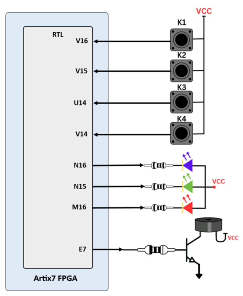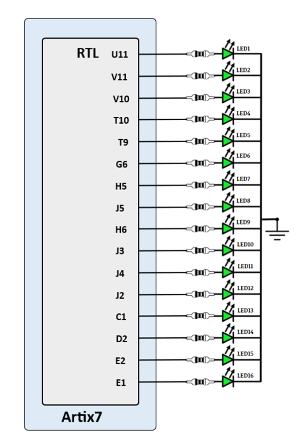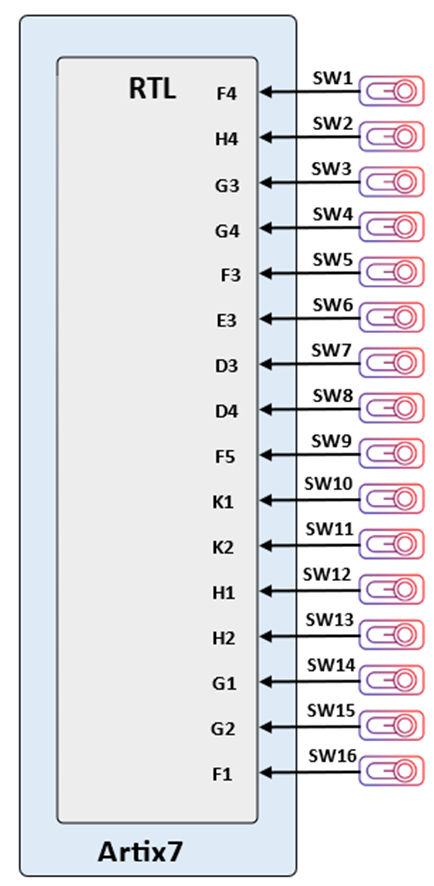 The EISLER ARTIX7 FPGA BOARD ARTIX7 FPGA A7board includes sixteen slide switches, four push buttons, sixteen individual LEDs, and a four-digit seven-segment display, as shown in the below diagram. The pushbuttons and slide switches are connected to the FPGA via series resistors to prevent damage from inadvertent short circuits (a short circuit could occur if an FPGA pin assigned to a pushbutton or slide switch was inadvertently defined as an output). The four pushbuttons are “momentary” switches that normally generate a high output when they are at rest, and a low output only when they are pressed. Slide switches generate constant high or low inputs depending on their position.