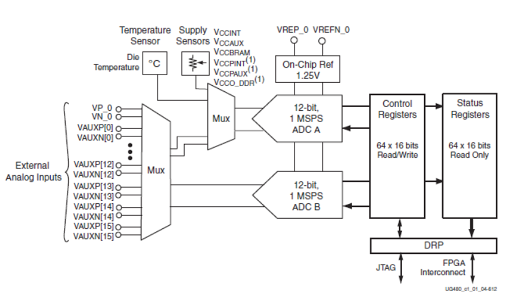 The XADC supports a wide range of operating modes such as single channel, sequenced channel, duel ADC simultaneous sequence, or one-pass sequence channel sampling; event driven or continuous sampling operation; unipolar, differential, or bipolar signal sampling; etc… The XADC can also be configured to power down its individual ADCs, rearrange the order of sampling when running in a sequenced channel operation, enable averaging of samples to reduce noise, set alarms for user defined voltage and temperature tolerance violations for on-chip sensors, etc… The image below shows the block diagram of the XADC as found in the datasheet for the device as provided by Xilinix. You can download the datasheets for the XADC by clinking on the button below.