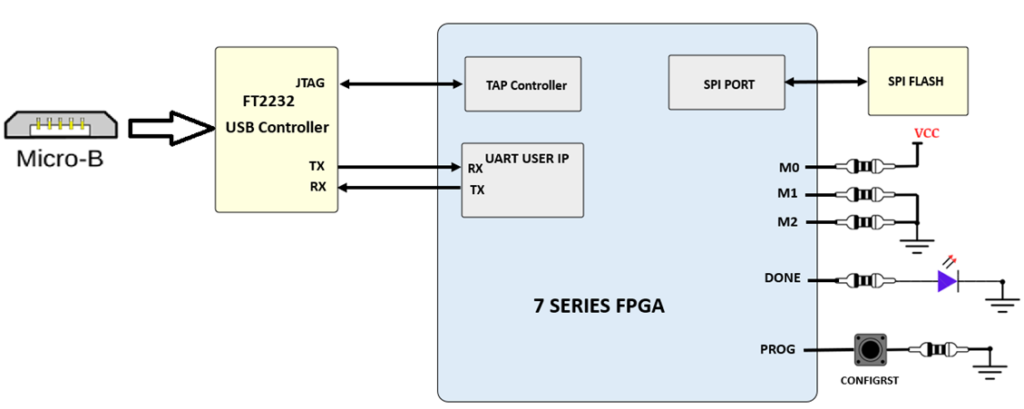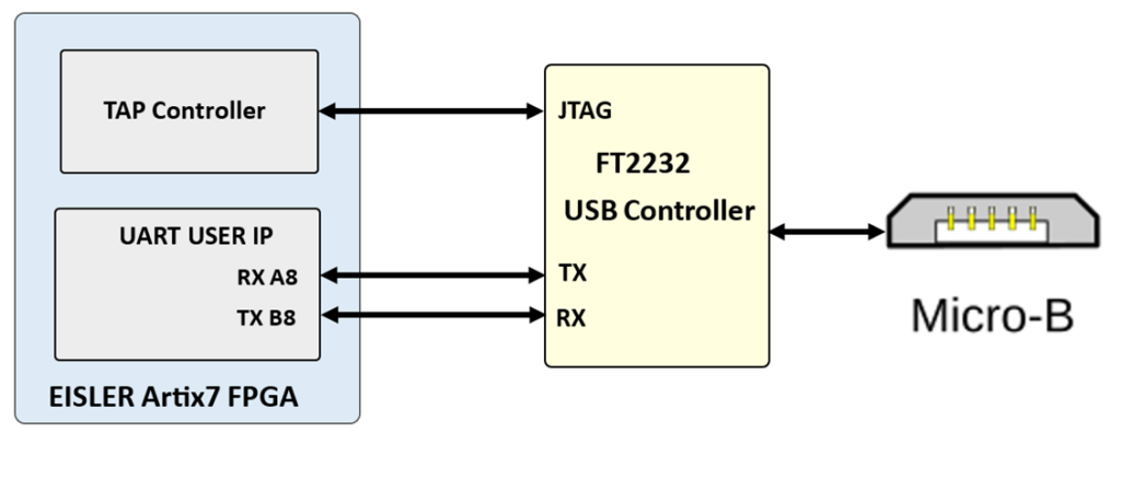 The FT2232HL is also used as the controller for the USB-JTAG circuitry, but the USB-UART and USB-JTAG functions behave entirely independent of one another. Programmers interested in using the UART functionality of the FT2232 within their design do not need to worry about the JTAG circuitry interfering with the UART data transfers, and vice-versa. The combination of these two features into a single device allows the EISLER ARTIX7 FPGA BOARD ARTIX7 FPGA A7 to be programmed, communicated with via UART, and powered from a computer attached with a single Micro USB cable. The connections between the FT2232L and the Artix-7 are shown in the below figure.