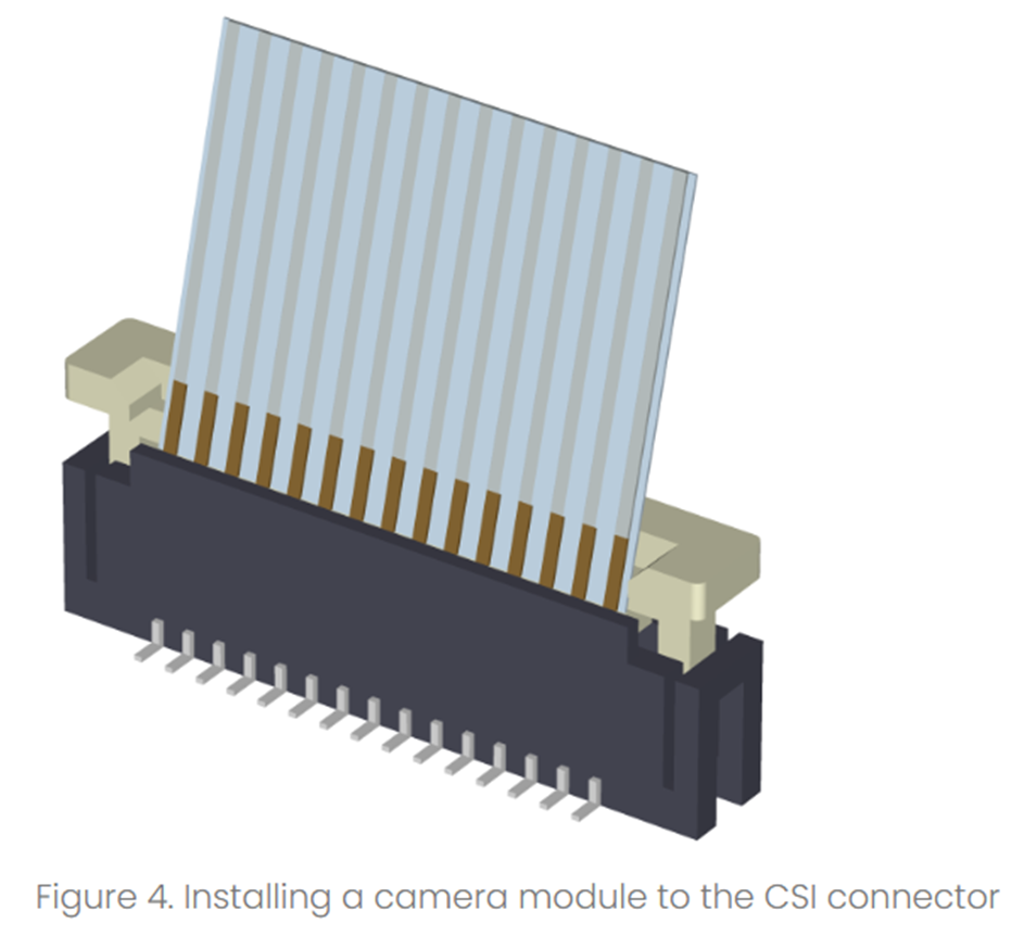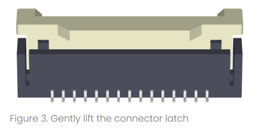 To install a camera module, connect its flex ribbon cable into the camera connector. Follow these steps: