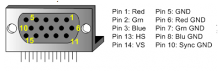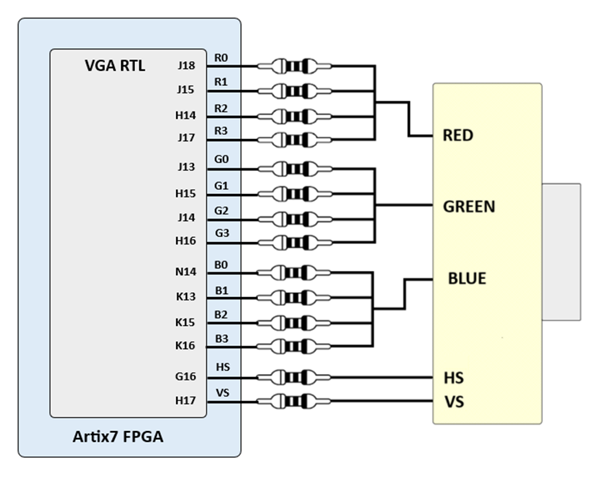 The EISLER ARTIX7 FPGA board uses 5 FPGA signals to create a VGA port with 1 bits-per-color and the two standard sync signals (HS – Horizontal Sync, and VS – Vertical Sync). The color signals use resistor-divider circuits that work in conjunction with the 82-ohm termination resistance of the VGA display to create 16 signal levels each on the red, green, and blue VGA signals.