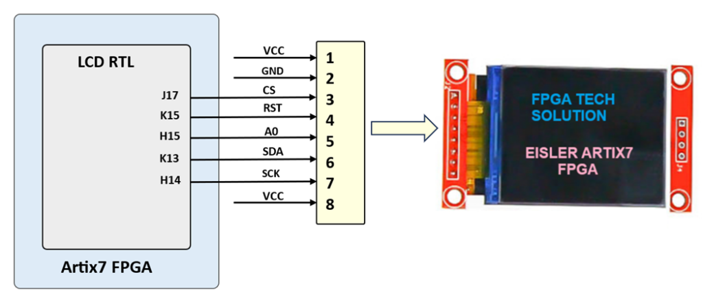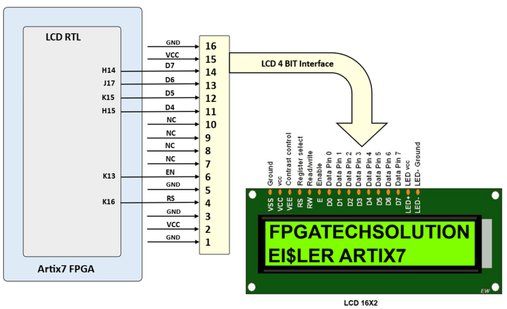 The EISLER ARTIX7 FPGAboard includes LCD16BY2 can be connected as show in following fig. LCD16BY2 is connected with 4bit interface mode