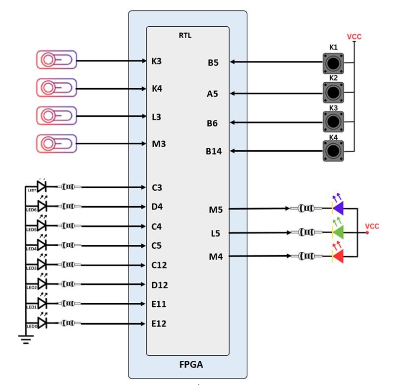 The MINI-S7 board includes sixteen slide switches, four push buttons, sixteen individual LEDs, and a four-digit seven-segment display, as shown in the below diagram. The pushbuttons and slide switches are connected to the FPGA via series resistors to prevent damage from inadvertent short circuits (a short circuit could occur if an FPGA pin assigned to a pushbutton or slide switch was inadvertently defined as an output). The four pushbuttons are “momentary” switches that normally generate a high output when they are at rest, and a low output only when they are pressed. Slide switches generate constant high or low inputs depending on their position.
