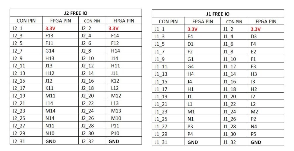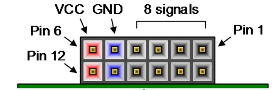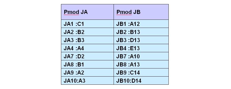 The Pmod ports are arranged in a 2×6 right-angle, and are 100-mil female connectors that mate with standard 2×6 pin headers. Each 12-pin Pmod ports provides two 3.3V VCC signals (pins 6 and 12), two Ground signals (pins 5 and 11), and eight logic signals. The VCC and Ground pins can deliver up to 1A of current. Pmod data signals are not matched pairs, and they are routed using best-available tracks without impedance control or delay matching. Pin assignments for the Pmod I/O connected to the FPGA are shown in the below table