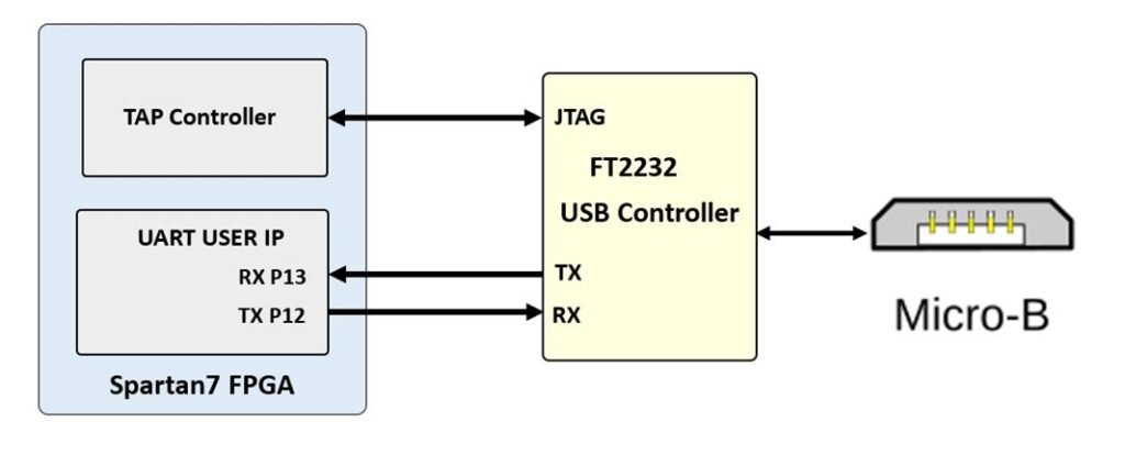 http://www.ftdichip.com/Support/Documents/DataSheets/ICs/DS_FT2232H.pdf USB-UART bridge (attached to connector J6) that allows you to use PC applications to communicate with the board using standard Windows COM port commands. Free USB-COM port drivers, available from www.ftdichip.com under the “Virtual Com Port” or VCP heading, convert USB packets to UART/serial port data. Serial port data is exchanged with the FPGA using a two-wire serial port (TXD/RXD). After the drivers are installed, I/O commands can be used from the PC directed to the COM port to produce serial data traffic on FPGA pins.