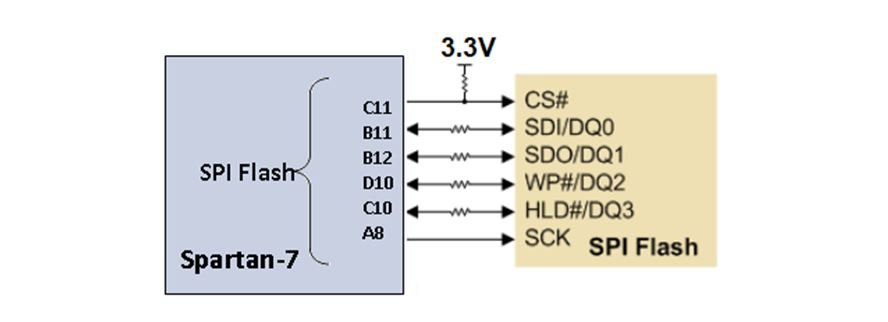 The MINI-S7 board contains a 32Mbit non-volatile serial Flash device, which is attached to the Spartan 7 FPGA using a dedicated quad-mode (x4) SPI bus. The connections and pin assignments between the FPGA and the serial flash device are shown the below figure