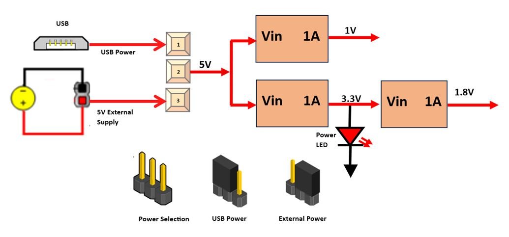 The MINI-S7uses +5V power supply to function properly. By default theboard is configured to use +5V supply from USB. So an external +5Vpower is not required unless USB port is unable to supply enoughcurrent. In most cases USB ports are capable of providing enoughcurrent for the module. Current requirement for this board largelydepends on your application. Please consult FPGA data sheet for moredetails on power requirements. If for any reason, an external 5V powersupply needs to be used for the module, the Power select jumper shouldbe configured properly as shown below When JP1 jumper is placed towards USB as shown in below image power is used from USB connector & when JP1 jumper is placed towards power connector power is used from external connector