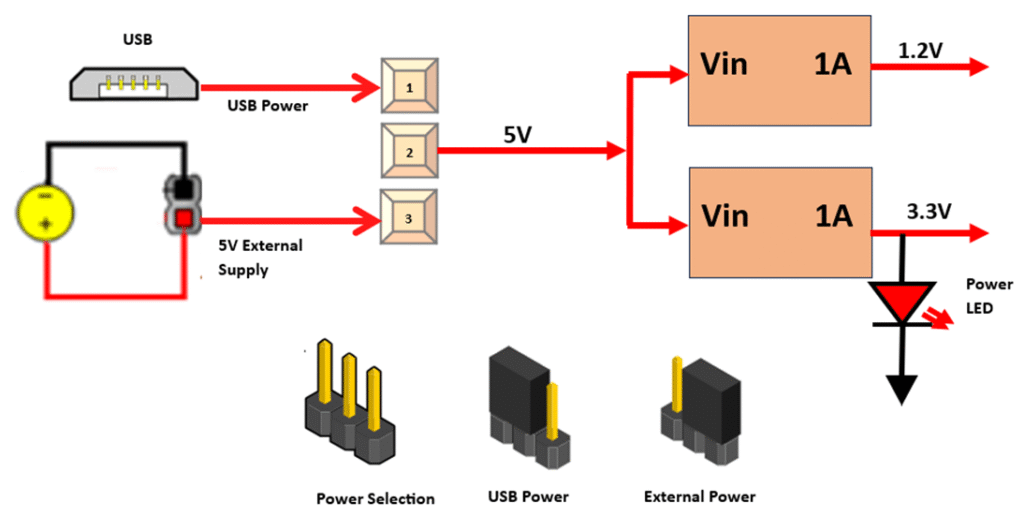 TheMINI-SP6-FPGAboard can work on USB power; you can also connect external 5VDC supply. When JP2 jumper is placed towards USB as shown in below imagepower is used from USB connector & when JP2 jumper is placed towards EXT power is used from J4 connector(J4 is optional)