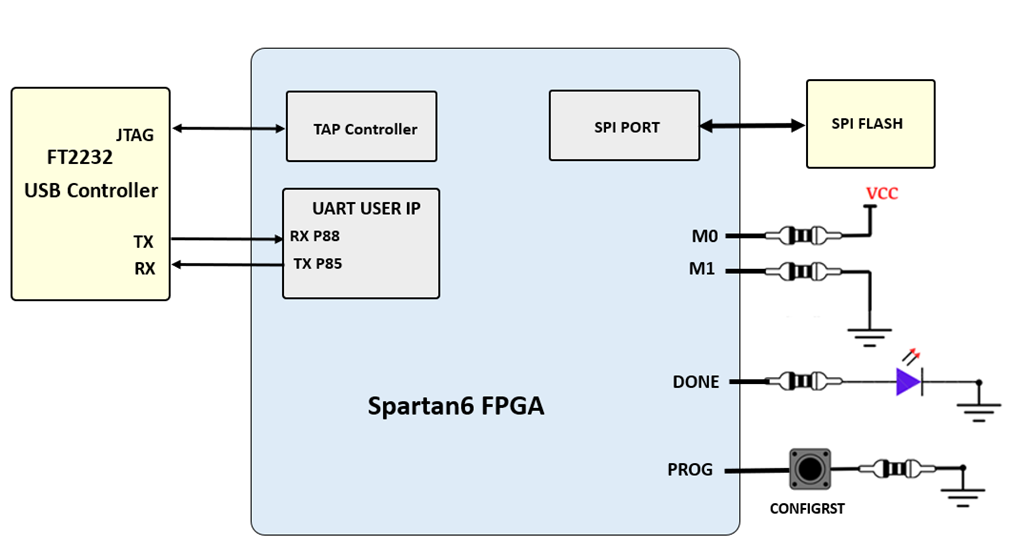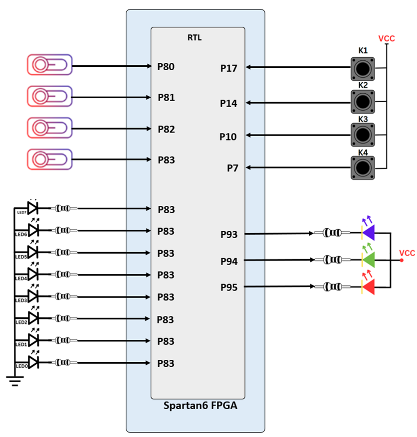 The Spartan6-Mini board includes 4dip switches, four push buttons, eight individual LEDs, and a RGB LED, as shown in the below diagram. The pushbuttons and slide switches are connected to the FPGA via series resistors to prevent damage from inadvertent short circuits (a short circuit could occur if an FPGA pin assigned to a pushbutton or slide switch was inadvertently defined as an output). The four pushbuttons are “momentary” switches that normally generate a high output when they are at rest, and a High output only when they are pressed. Slide switches generate constant high or low inputs depending on their position.