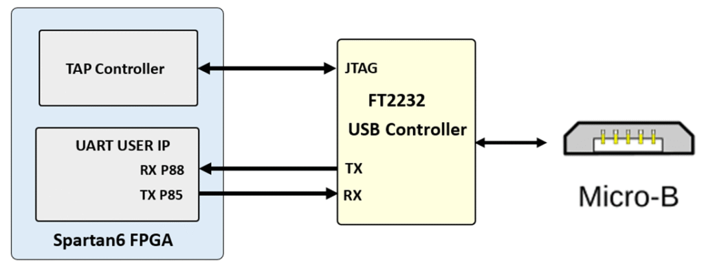 http://www.ftdichip.com/Support/Documents/DataSheets/ICs/DS_FT2232H.pdf USB-UART bridge (attached to connector J6) that allows you to use PC applications to communicate with the board using standard Windows COM port commands. Free USB-COM port drivers, available from www.ftdichip.com under the “Virtual Com Port” or VCP heading, convert USB packets to UART/serial port data. Serial port data is exchanged with the FPGA using a two-wire serial port (TXD/RXD). After the drivers are installed, I/O commands can be used from the PC directed to the COM port to produce serial data traffic on FPGA pins.