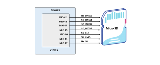 Zinky provides a microSD slot (J14) for non-volatile external memory storage as well as booting the Zynq. The slot is wired to Bank 1/501 MIO[40-47], including Card Detect. On the PS side peripheral SDIO 0 is mapped out to these pins and controls communication with the SD card. The pinout can be seen in Table 4. The peripheral controller supports 1-bit and 4-bit SD transfer modes, but does not support SPI mode. Based on the Zynq TRM, SDIO host mode is the only mode supported.