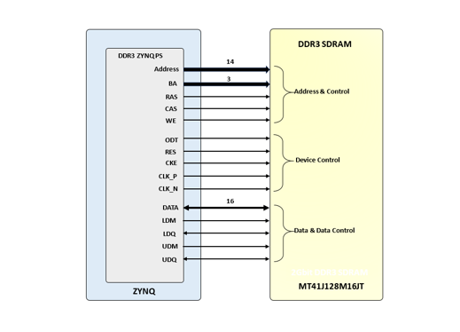 The ZINKY Board includes one MT41J128M16JT-125 memory component, creating a single rank, 16-bit wide interface. It is routed to a 1.5V-powered HR (High Range) FPGA bank with 50 ohm controlled single-ended trace impedance. 50 ohm internal terminations in the FPGA are used to match the trace characteristics. Similarly, on the memory side, on-die terminations (ODT) are used for impedance matching.