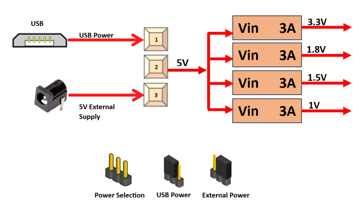 The ZINKY  Zynq7000 SoC board uses +5V to 18V power supply to function properly. By default the board is configured to use +5V to 18V supply from USB. So an external +5V to 18V power is not required unless USB port is unable to supply enough current. In most cases USB ports are capable of providing enough current for the module. Current requirement for this board largely depends on your application. Please consult Zynq7000 data sheet for more details on power requirements. If for any reason, an external +5V to 18V  power supply needs to be used for the module, the Power select jumper should be configured properly as shown below When JP1 jumper is placed towards USB as shown in below image power is used from USB connector & when JP1 jumper is placed towards power connector power is used from external connector