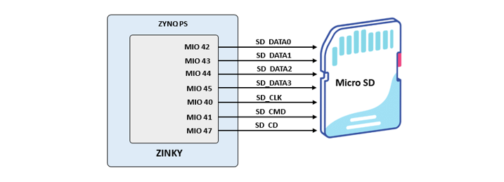 Zinky provides a microSD slot (J14) for non-volatile external memory storage as well as booting the Zynq. The slot is wired to Bank 1/501 MIO[40-47], including Card Detect. On the PS side peripheral SDIO 0 is mapped out to these pins and controls communication with the SD card. The pinout can be seen in Table 4. The peripheral controller supports 1-bit and 4-bit SD transfer modes, but does not support SPI mode. Based on the Zynq TRM, SDIO host mode is the only mode supported.