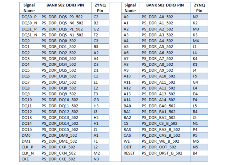 The DDR3 memory system is directly connected to the memory interface of the BANK 502 of the ZYNQ processing system (PS).Both the memory chips and the PS DDR bank are powered from the 1.5V supply. The mid-point reference of 0.75V is created with a simple resistor divider and is available to the Zynq as external reference.